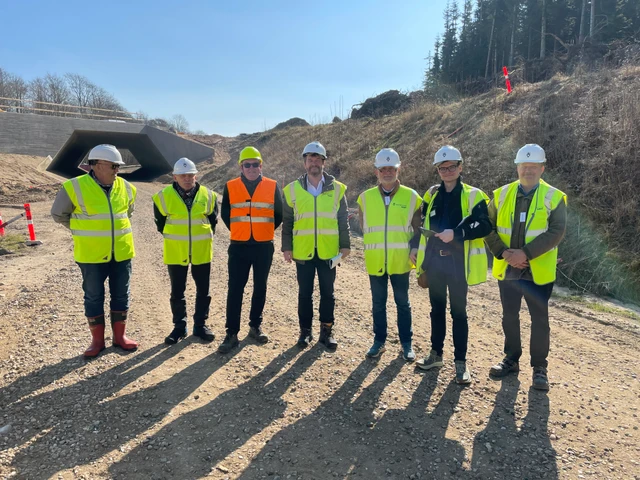 Taksationskommissionen for Nord- og Midtjylland på besigtigelse i dejligt forårsvejr med sikkerhedsudstyr og solstråler.